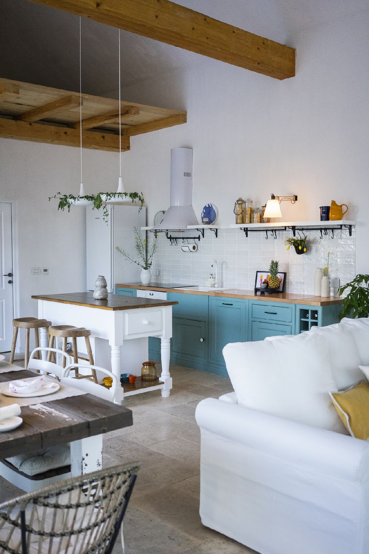 Chiar dacă în decor regăsim accente de galben, principala pată de culoare este dată de mobila din bucătărie. Galbenul și turcoazul nu au fost alese „ca să dea bine”, ci au venit natural, inspirate din culorile Deltei.