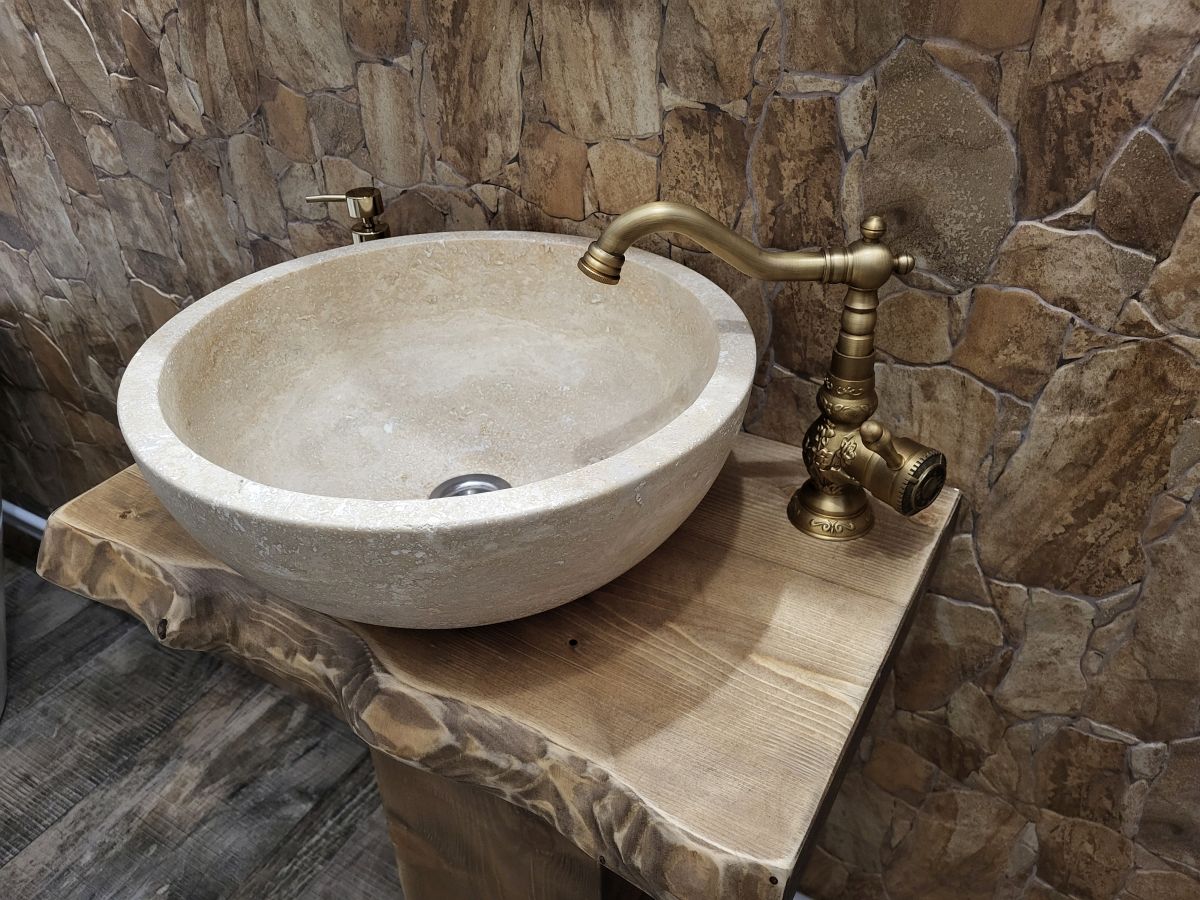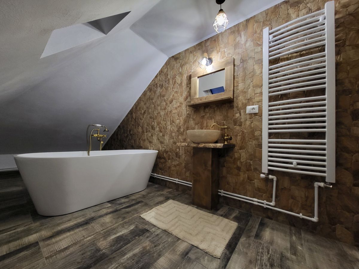 Chiar și acolo unde au fost necesare soluții contemporane — cum este cazul băilor — materialele au fost alese astfel încât să păstreze coerența vizuală a casei.